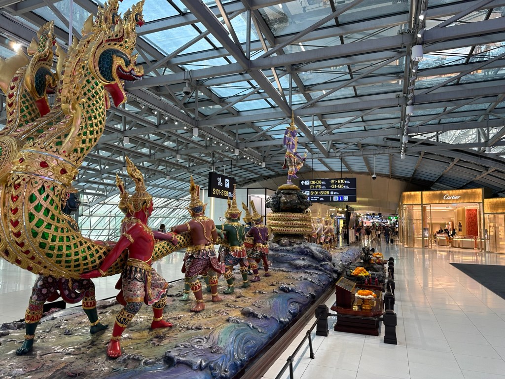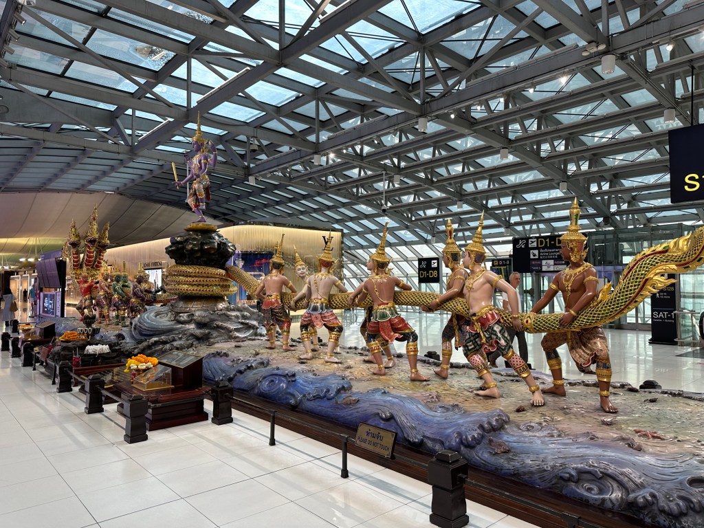 On clearing passport control at Suvarnabhumi Airport (BKK) one is confronted by a large installation of sculptures engaged in an apparent tug-of-war. In the heart of Hindu mythology lies the tale of Samudra Manthan, the grand Churning of the Cosmic Ocean. The churning process was believed to release the treasures of the ocean, including the elixir of immortality, known as Amrita.