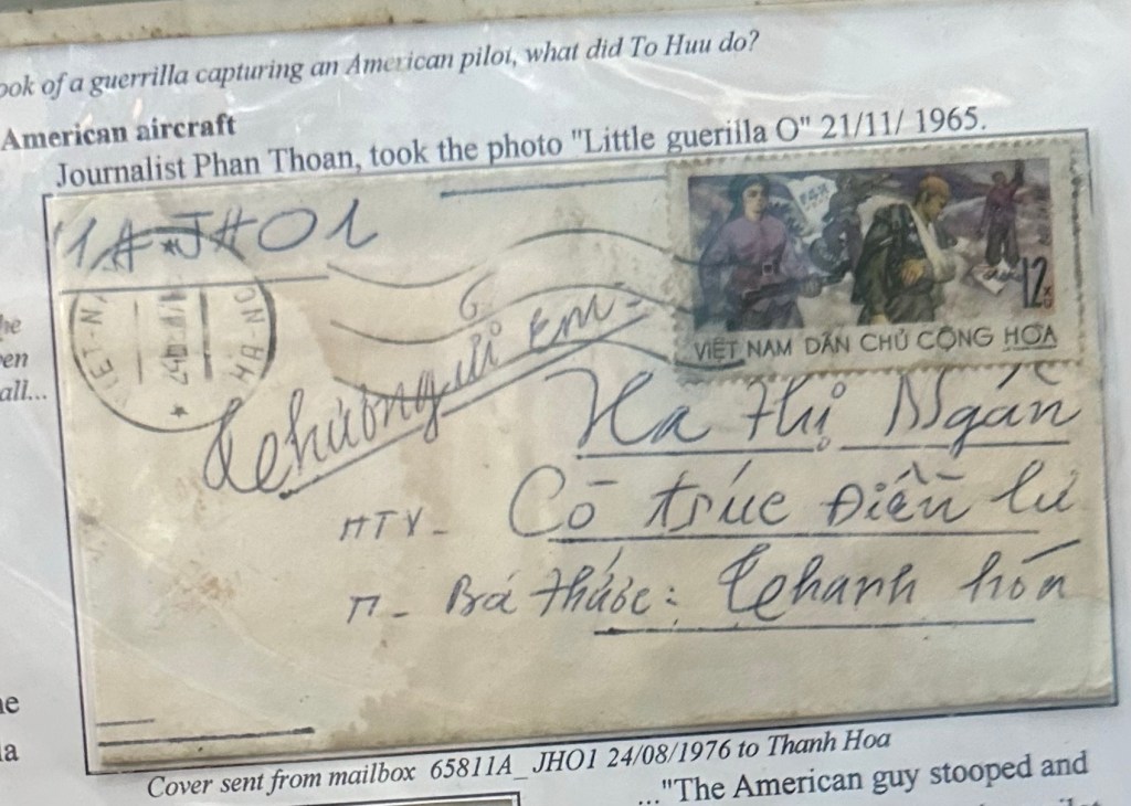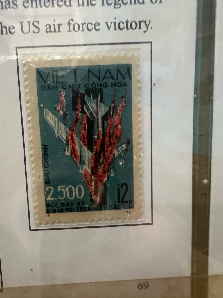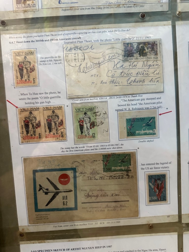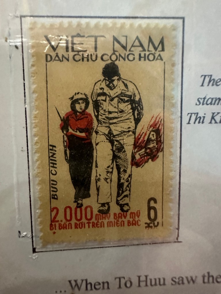 This particular stamp features captured American pilot W. A. Robinson, escorted by Viet Cong guerilla Ms. Nguyen Thi Kim Lai. Marginalia notes the height differential between the two; 1.4m:2.2m.