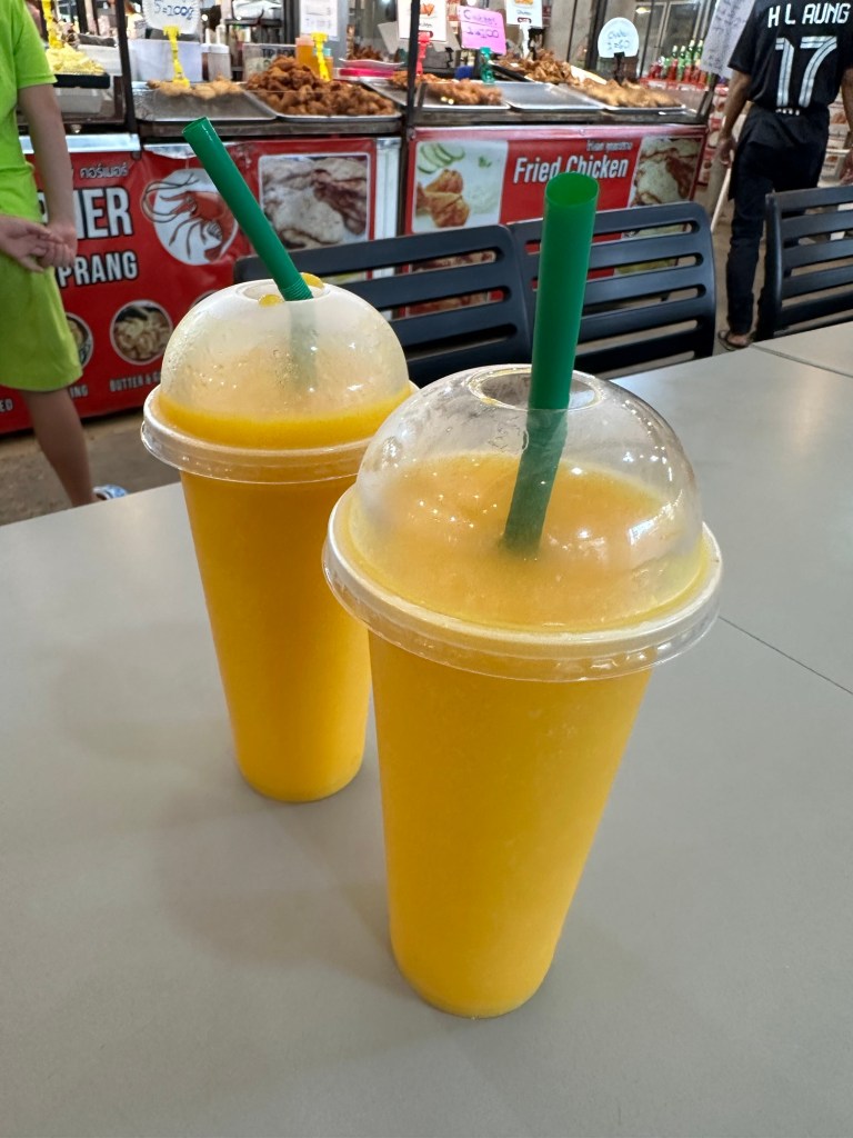 Two freshly squeezed and made – in front of you, nothing added – mango smoothies: 100 Thai Baht (£2.30). Worth every penny. Sublime!