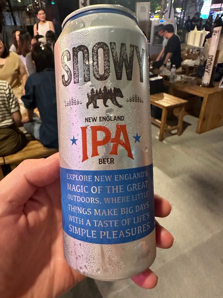 So, it was a very tasty burger each + a can of ‘Snowy’. Yeah, new one on me,too. Not bad though, a white beer.